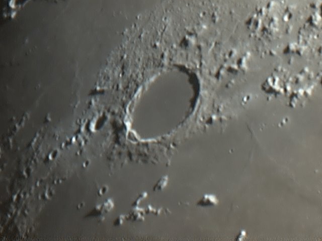 Krater Plato Durchmesser ca. 101km Kraterwandhöhe 2400m Aufgenommen mit dem 200mm F6 GSO Spiegelteleskop auf einer HEQ5. Es war stark windig und kalt (-5Grad und feucht). Das Seeing war geprägt von starkem Wabern und nur sehr wenigen ruhigen Augenblicken 1200 Bilder mit 5% Verwendung in Giotto gemittelt dann den Blaukanal neu berechnet und leicht nachgeschäft. |