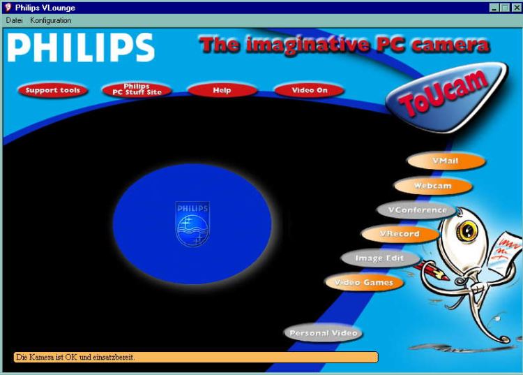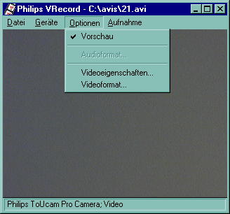 Rechner von Vorteil. Eine astrotaugliche Webcam mit IR-Sperrfilter (zur Not geht es auch ohne, aber die Bilder werden schärfer wenn man einen hat). Hier in meinem Beispiel eine Phillips ToUCam 740K mit einem 1.25 Zoll Adapter. Das USB-Kabel zum Rechner darf aber auf keinen Fall länger als 5 Meter sein, sonst sind die Signale zu schwach und kommen nicht mehr an (es gibt aber aktive Repeater, die das Signal verstärken können). Besser ist es sowieso den Monitor direkt neben dem Teleskop zu haben, da man doch she genau die Schärfe einstellen muß. Ich empfehle den ganzen Aufbau einmal am Tage zu machen und nach Möglichkeit an einem Punkt, wo man ca 5-10km weit sehen kann. Dort erst mal alles aufbauen und die Software von Phillips starten. Andere benutzen direkt Giotto zum Aufnehmen, ich mache das nicht. Also dann im Auswahlmenü das Programm VRecord starten. Sobald das läuft, kann das Auswahlprogramm geschlossen werden. |