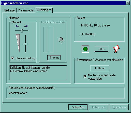 | Hier muß jetzt noch die Audioaufzeichnung abgeschaltet werden. Erstens braucht man die nicht und zweites