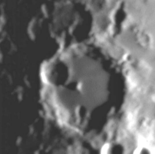 mit 4000 Meter hohen Wänden sowie einem etwa 2000 Meter hohem Zentralberg Ein weiterer Krater links vom Zentralberg mit dem Namen Klein, der hat einen Durchmesser von 44km und ein noch kleinerer unter dem Zentralberg mit nur noch ca 11km Breite. Es gibt noch einige weitere sehr kleinen Krater im Innern von Albategnius, aber die liegen unter der Auflösungsgrenze bei diesem Seeing und mit meinem Instrument. |